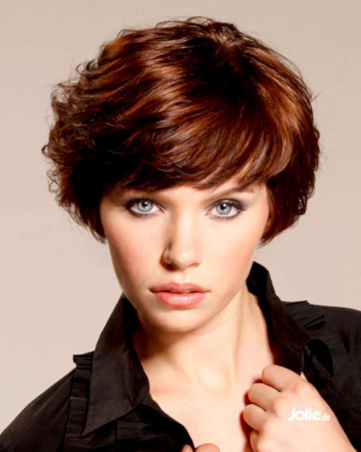 Простой по своему виду гарсон с челкой смотрится женственно и легко. Короткая прическа позволяет внести в образ немного воздушности, а также дама получит заметный омолаживающий эффект. Немного удлиненные пряди на макушке, спускающиеся к вискам позволят придумывать разные укладки.
