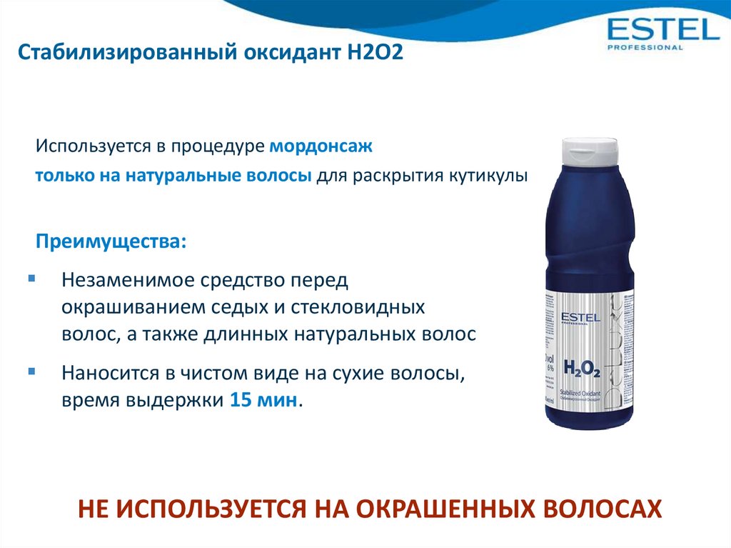 Не предназначен для осветления или затемнения, только для окрашивания красками одинаковой интенсивности и для обновления цвета по длине (если волос толстый и жесткий). Не применяется для седых волос. 6% — применяется для осветления на 1-2 тона и ранней (мягкой) седины.