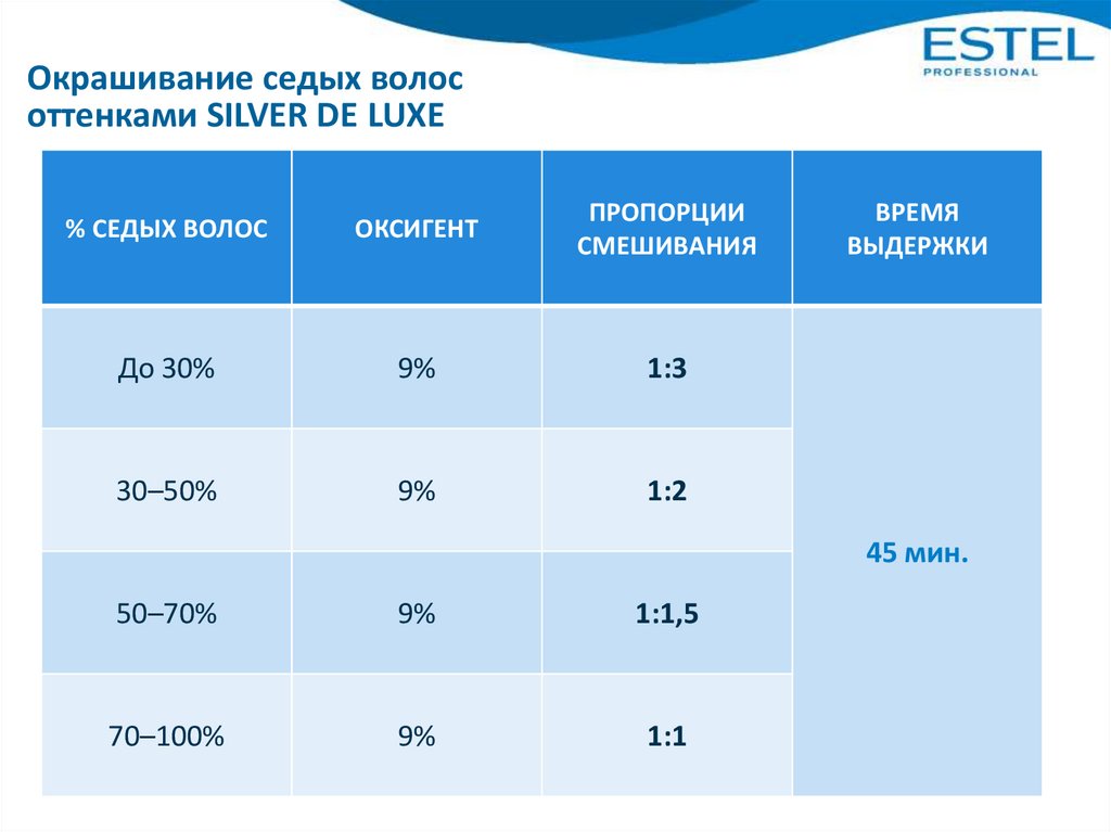 Как правило, очаговая седина занимает менее 20% волос. Если седина не превышает 30%, то подойдет окислитель 3, 4 и 6%. Если седины от 50%, рекомендуется использовать окислитель 6 или 9%.