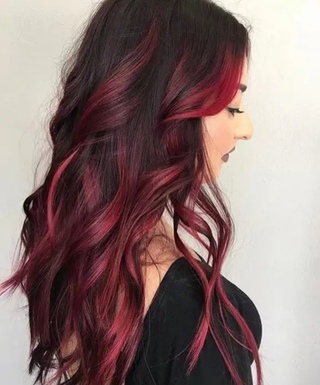 Эта привлекательная смесь яркого вишнево-красного и темно-коричневого прекрасно сочетается с длинными кудрявыми волосами. Попросите смесь из темно-каштанового коричневого и ярко-красного ягодного оттенка для идеального сочетания теплых и прохладных тонов.