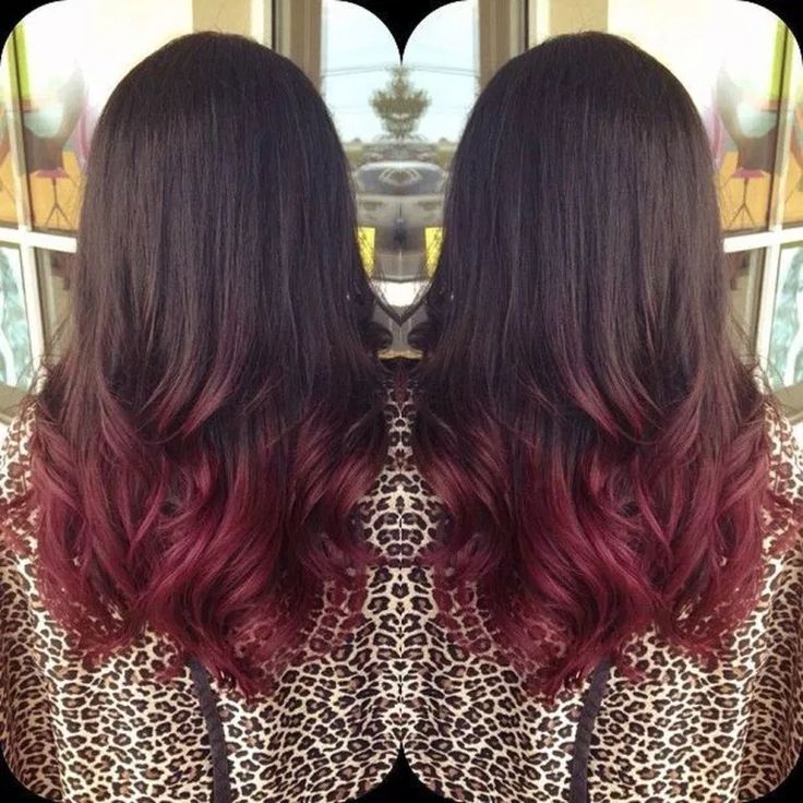 Если волосы сами по себе темные, красно-фиолетовый вариант подчеркнет их объем и глубину цвета. Как правило, делается постепенный переход от темных корней с красным кончикам через фиолетовый тон.