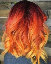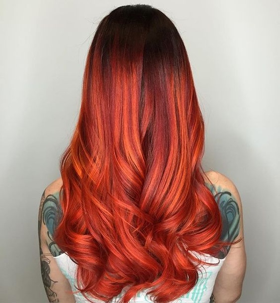 Идеально для длины ниже плеч и более, но применяются и на коротких волосах (с небольшими ограничениями). Рыжее омбре – это внедрение сочных, ярких оттенков красного, желтого и промежуточного рыжего. Изменение цвета может происходить в различных вариациях.