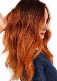 Если вы готовы экспериментировать со всей длиной от корней до кончиков, есть много красивых вариантов, к примеру, насыщенный красный у корней, плавно переходящий через оранжевые блики в теплый песочный на концах. Стрижка слоями на средней длине, «лесенки», стрижки с волосами разной длины, со сглаженными или подчеркнутыми переходами плюс рыжее омбре – прекрасная комбинация.