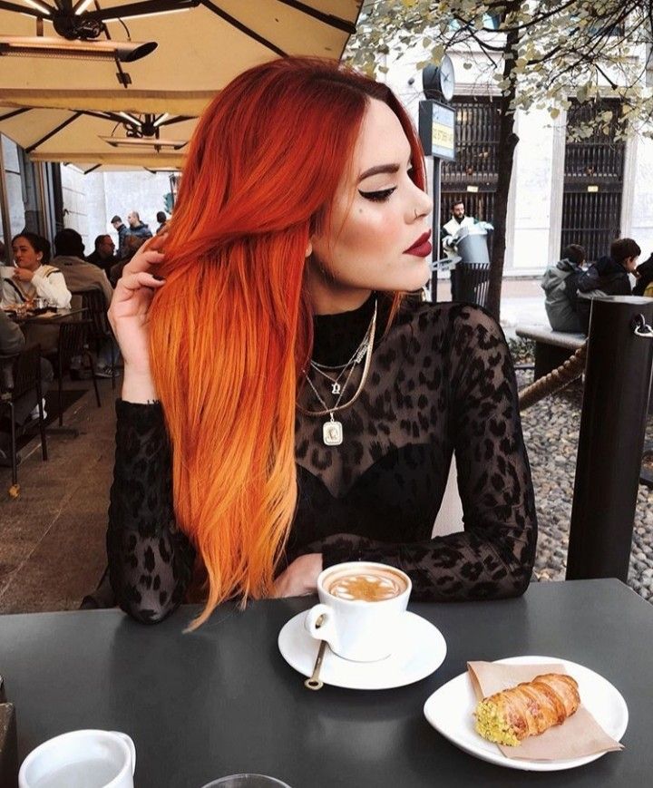 - Темной шатенке или брюнетке, чтобы получить красивое омбре с рыжиной, обычно достаточно лишь осветлить до нужной степени нижнюю часть прядей. Это очень удобно, так как волосы не подвергаются дополнительному окрашиванию и их не нужно постоянно тонировать, дабы придать образу яркость.