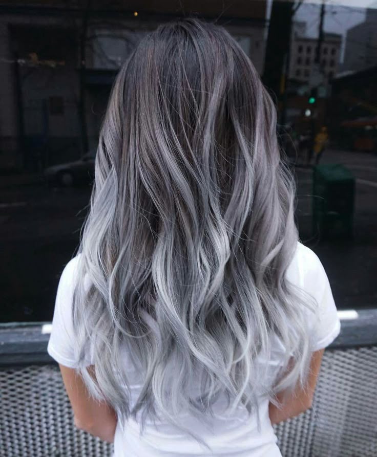 - Омбре в этом цвете – великолепное решение для женщин с длинными локонами, на них можно воссоздать эффектный переход из нескольких оттенков. Можно применить, например, такое сочетание темно-русый-пепельный-белый.