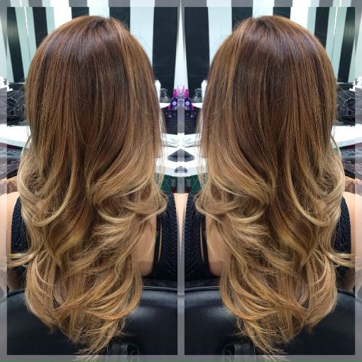 Балаяж — очень похож на бейбилайтс, только пряди и переходы уже более контрастные. При техники окрашивания балаяж осветляется 30-50% волос. Техника очень здорово смотрится на шоколадных волосах, русых натуральных и окрашенных, на натуральных блондинках и даже на окрашенных блондинках.