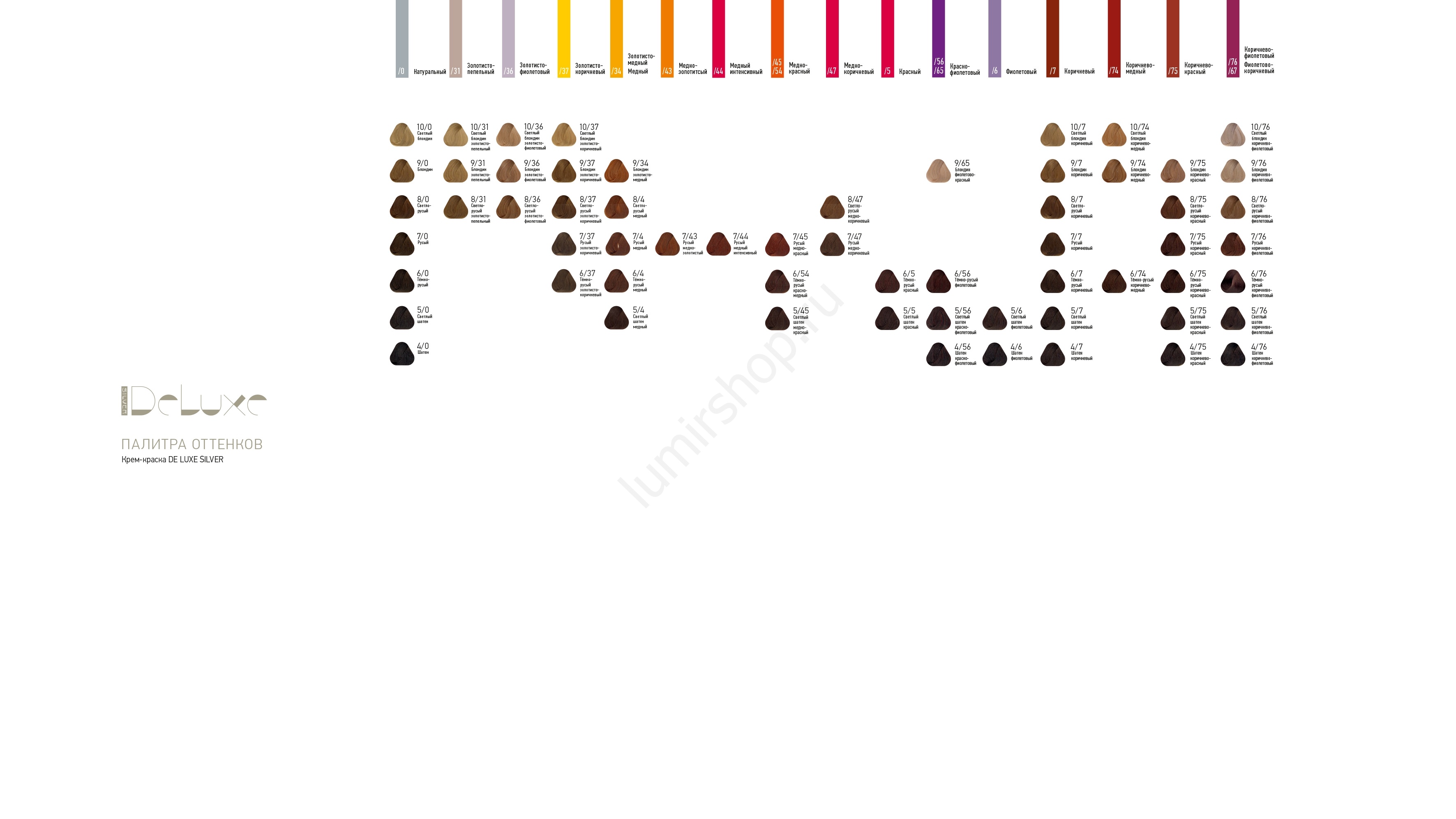 Палитра Estel De Luxe (основная) — обеспечивает глубокие, насыщенные цвета, живой блеск и мягкость волос. На 100% закрашивает седину.