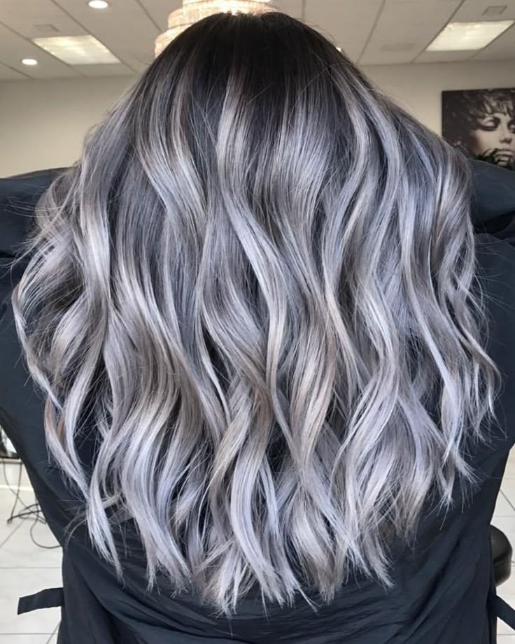 3. Насыщенный серый градиент. Подходит для экспериментов с яркими цветами. Темные корни переходят в серый цвет, а из него в синий, фиолетовый, бардовый или другой оттенок по вкусу.