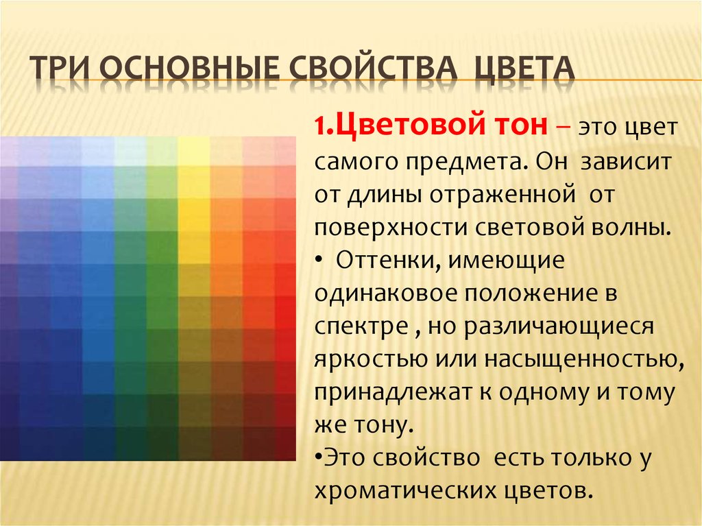 1. Цветовой тон – качество цвета, когда этот цвет можно приравнять к одному из спектральных цветов. Другими словами – это само название цвета.
