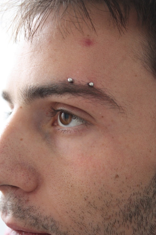 Выполняется путем захвата участка кожи в районе надбровной дуги, который прокалывается сверху вниз. В него обычно ставится штанга с декором в виде кристаллов, шипов. Относительно небезопасная разновидность, есть существенный риск развития воспалительной реакции. Процесс заживления дольше чем при других разновидностях пирсинга.