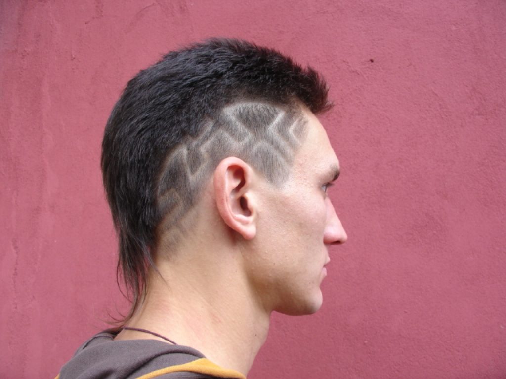 Мужская насадка для волосВолосы не обязательно должны быть длинными для ирокеза. Этот короткий остроконечный вырез, который сужается в V сзади, делает свое дело.