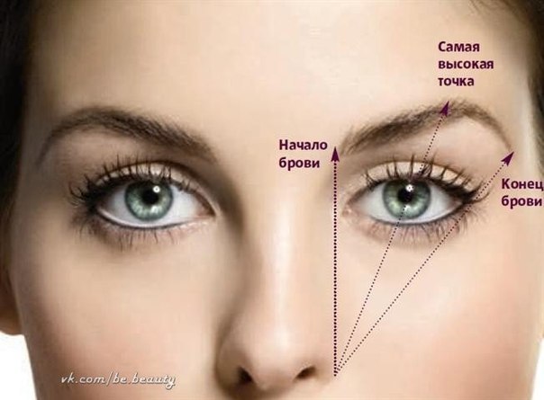 - Начало брови должно совпадать с верхней точкой ноздри.