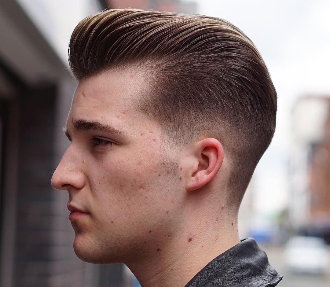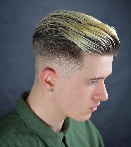 Волосы коротко острижены сзади и по бокам и оставлены длиннее на макушке.