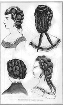 В женских прическах преобладали завитые локоны, делались прически и из прямых волос. волосы зачесывались от макушки и от виска к виску, через лоб шла ровная горизонтальная линия. Волосы сзади подстригали полукругом, завивали и подгибали концы.