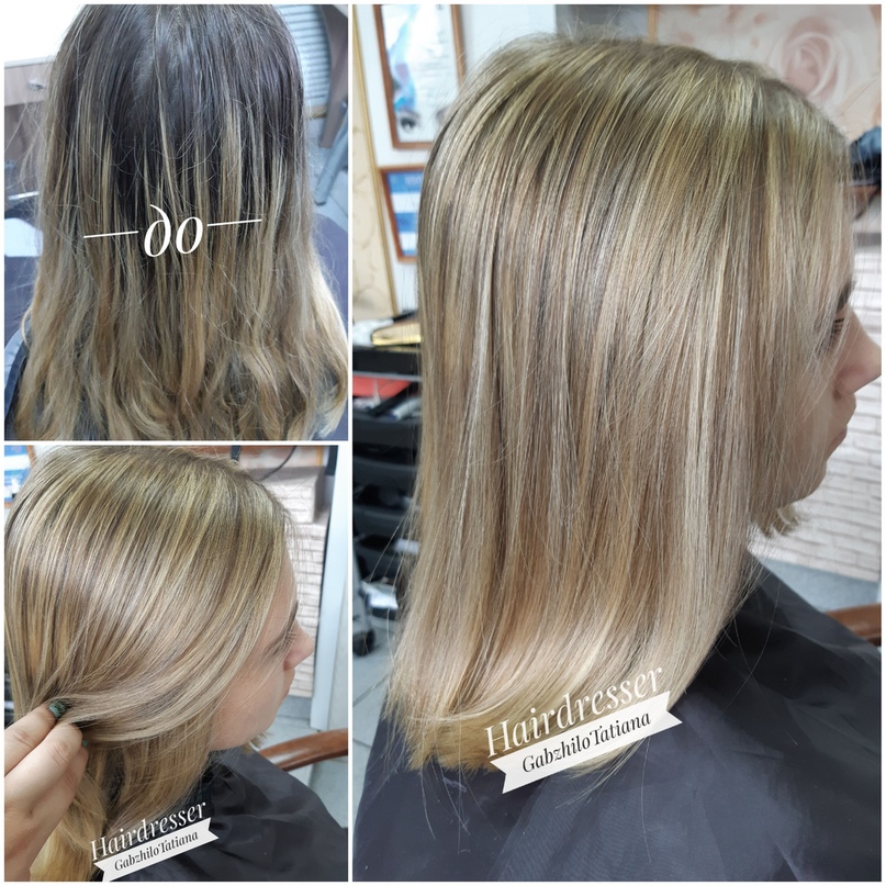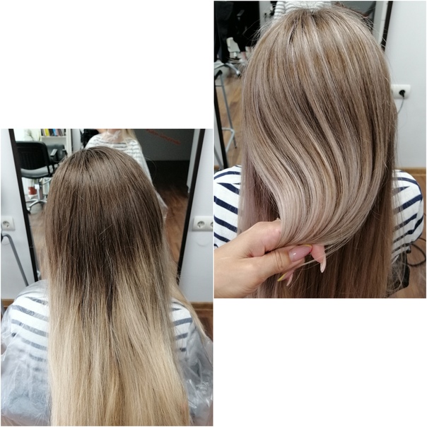 4 часа работы понадобилось, чтобы привести оттенок волос в порядокНа фото моя модель, которая уже имеет отросшую прикорнувшую зону 4-5 см. По неоднородному фону осветления всей длины волос понятно, что такой подход к окрашиванию для нее не является исключением.