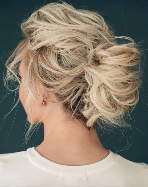 По такому же принципу можно создать небрежный пучок из волос. Для этого перед работой нанесите на волосы немного пенки и сожмите пряди в руках несколько раз. Позвольте им высохнуть и соберите в хвост, после чего выполните все описанные действия, не приглаживая локоны. В результате, у вас получится эффектная прическа, как на фото.