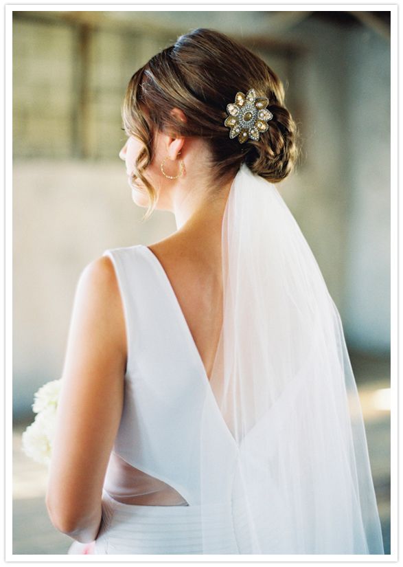 2) Наденьте свадебную фату под пучок на затылке, чтобы создать более непринужденный и модный образ невесты.