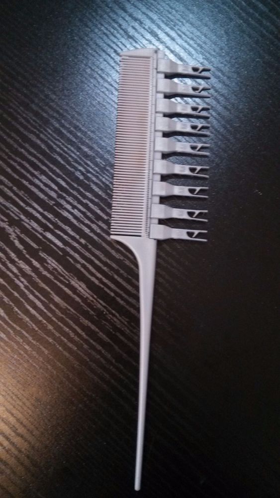 Расчёска эта — с металлическим кончиком, карбоновая. То есть значит — что она очень долговечная и прочная! И именно такой спицей на конце расчёски — удобно «штопать» прядки для мелирования. И, ещё лайфхак: можно делать самостоятельное окрашивание не на фольге, а на порезанных пакетах-майках типа «спасибо за покупку», точно так же, на большие прямоугольники, подкладывая их на лопатку перед нанесением краски, а после — накрывая другим листочком такого же формата. Обязательно нужно отступать от края такого прямоугольника на сантиметр-два, чтобы смесь на попала на корни, при перебрасывании этих «бутербродов» с краской! И именно при помощи спицы на расчёске, придерживая ею края пакетов с прядями у корней параллельно. Открою секрет: я всегда, абсолютно всегда крашусь на пакетики! И раньше даже без лопатки-планшета, опираясь, намазывая краску или на ладонь, или на свою голову! 🛍😀