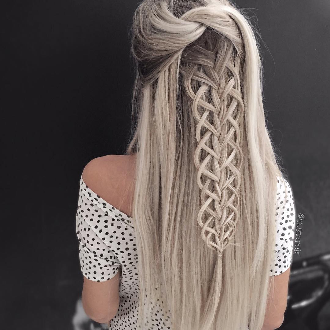 Представьте себя в декорированном выпускном платье с открытой спиной, украшенном этой потрясающей прической в виде плетеной булочки! Вы непременно станете «звездой ночи», верно? Просто убедитесь, что вы разгладили мелированные светлые волосы, обильно нанеся сыворотку.