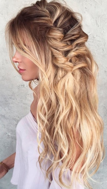 Вот вам поистине гламурный образ, который может вызвать зависть у всех на выпускном вечере! Придайте текстуру всем волосам, закатайте переднюю часть назад, создав красивую затяжку, и прикрепите ее к макушке с помощью заколки для бобби. Теперь заплетите остальные волосы в косу и придайте кончикам идеальный эффект легкости.