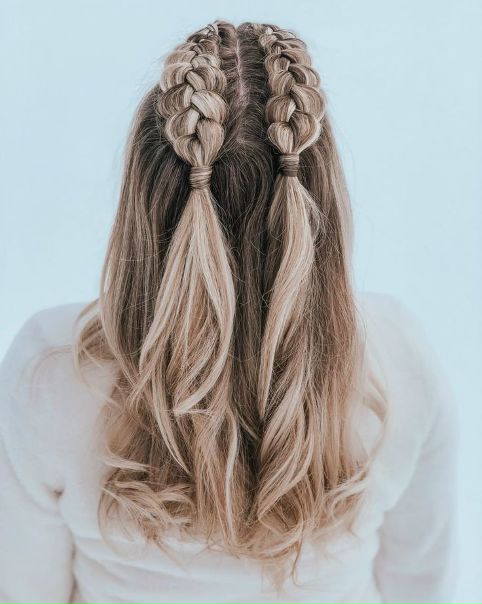 - На каждой половине заплести вывернутую французскую косу так, чтобы получились две вертикальные параллельные косички.