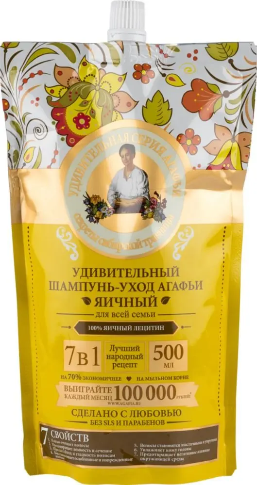 Под этой маркой производится широкий ассортимент шампуней с отсутствием сульфата в составе. Каждая девушка может выбрать средство под свой тип волос. Такой косметический продукт ухаживает за локонами и насыщает их полезными элементами. Кроме того, средства из линейки “Рецепты бабушки Агафьи” возвращают волосам блеск и делают их более объемными.
