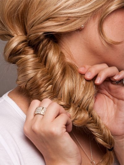 Отделение прядей, с последующим перекидыванием с одной части волос в другую постепенно создает прическу рыбий хвост.