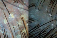 Я конечно же посмотрела свою кожу головы на этом аппарате и нашла у себя сальные пробки. Их немного, но есть.(Но и я чисто физически не могу осмотреть каждый фолликул!) И так же есть волосы разной толщины в месте их скопления.