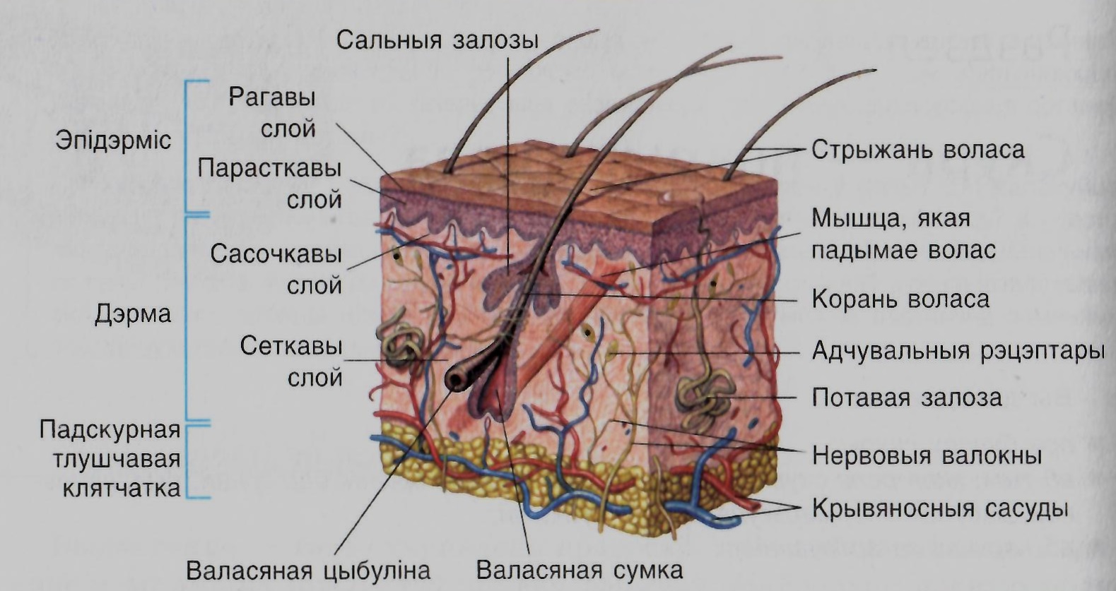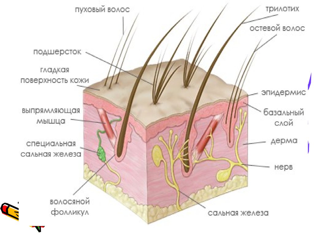 Общий кожный покров, срез кожи, показывающий эпидермис и дерму; волос в фолликуле; мышца, выпрямляющая волосы; сальные железы.
