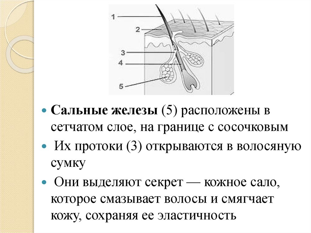 Сальные железы расположены в средней части дермы и почти всегда развиваются рядом с волосяным фолликулом, выходное отверстие которого впадает в фолликулярный канал.