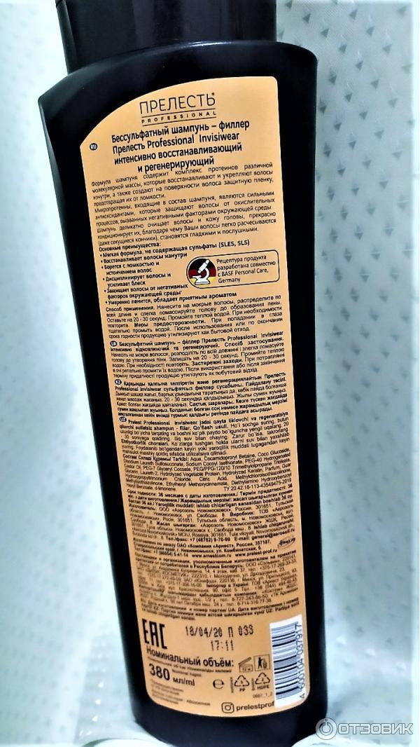 Безсульфатный шампунь деликатно очищает волосы и кожу головы. Современные компоненты в составе бессульфатного шампуня защищают волосы от выцветания, помогая продлить его яркость и насыщенность. Шампунь Прелесть Professional восстанавливает волосы после окрашивания, придает им блеск, бережет их структуру.