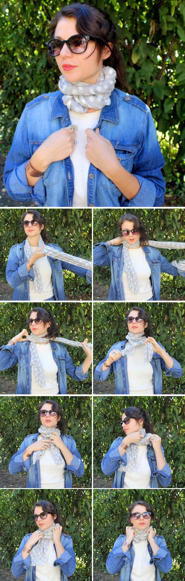 Простой способ, когда связывают концы палантина, узелок перемещают под шею, шарф красиво расправляют на груди. Можно также его слегка перекрутить, добавив объемных складок.