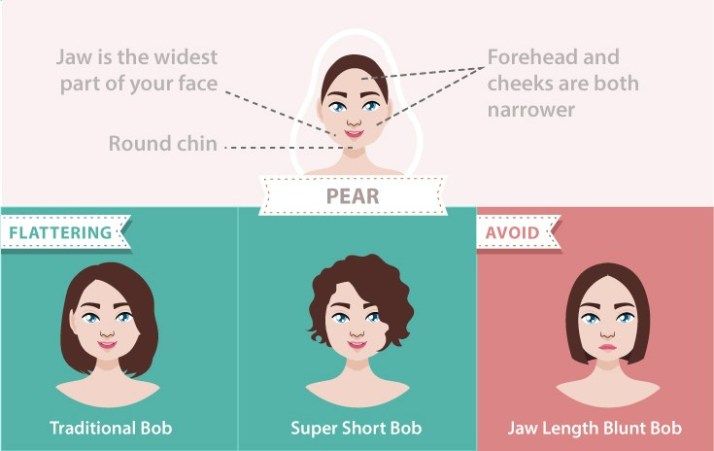 Лицо в форме груши имеет узкий лоб и широкую челюсть. Чтобы скорректировать этот нюанс, прикройте лоб прямой челкой и перенесите объем на уровень подбородка. Если позволяет длина, сделайте слоистую стрижку. Если мечтаете о короткой стрижке, остановитесь на бобе. Кстати, для вьющихся прядей этот вариант просто идеален.