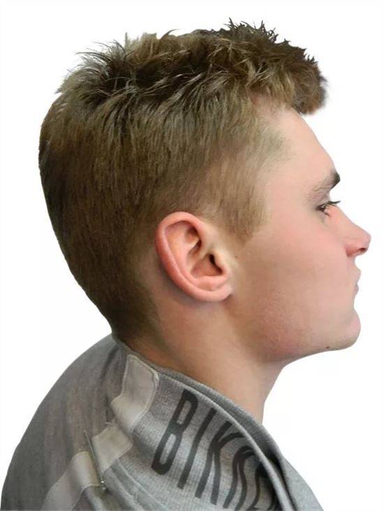 Модные тенденции не обходят и наиболее известную и востребованную разновидность – короткий или же некий ирокез на бок. Сочетается с любым типом лица. Отказаться стоит лишь слишком худым и щуплым парням, ведь небольшая высота гребня визуально сильнее подчеркнет вашу худобу. Длина прядей не превышает 1-2 мм. Помните, что здесь полностью выбриваются виски. Поэтому соглашаются обычно экстравагантные личности и футболисты.