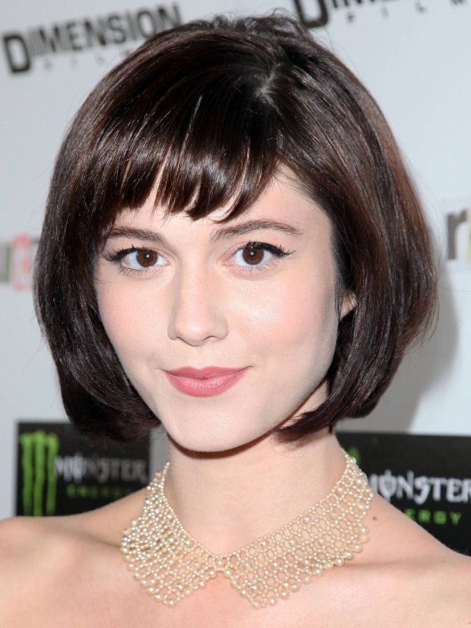 Каре с короткой челкой – отличное решение для желающих спрятать недостатки лица, а его варианты могут быть абсолютно различными. В этом есть некоторое противоречие, так как с подобной причёской человек выглядит более открыто. Для стрижки подходят прямые и вьющиеся волосы, но нужно учитывать, что их часть формирует чёлку, и это не должно существенно повлиять на густоту всей причёски.