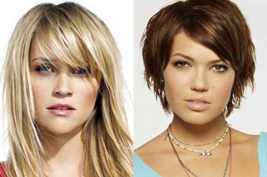 Самым удачным вариантом тут будет удлиненная косая челка. В сочетании с градуировкой вытянутая от виска до подбородка, она зрительно удлинит лицо и чуть прикроет щечки.