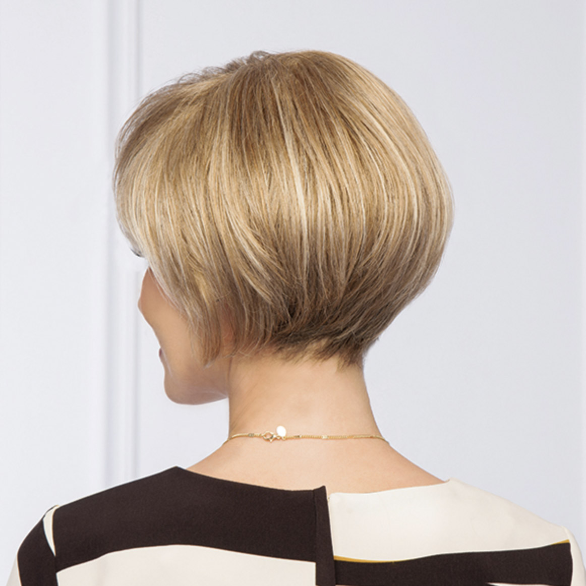 А сзади волосы подстрижены так же, как у каре на ножке. Верхние длинные пряди срезаны ровной линией и накрывают короткие нижние.