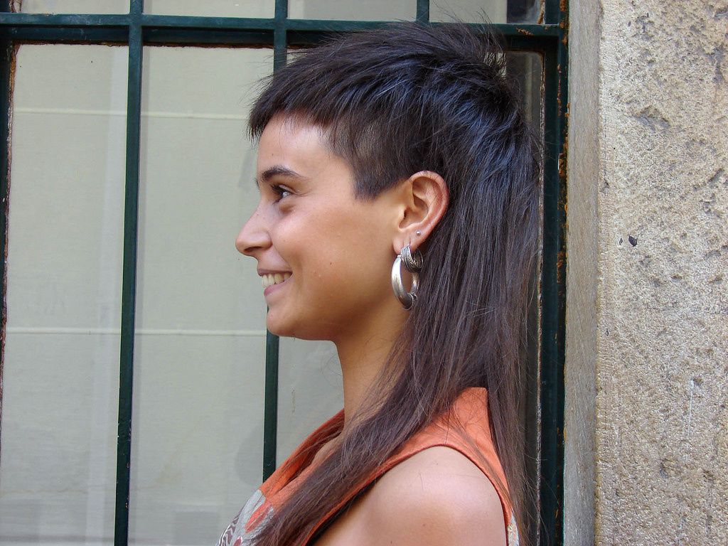 Ее волосы коротко подстрижены на фотографии выше, со свежей стрижкой вокруг бакенбардов. У этой женской прически такая рокерская атмосфера.