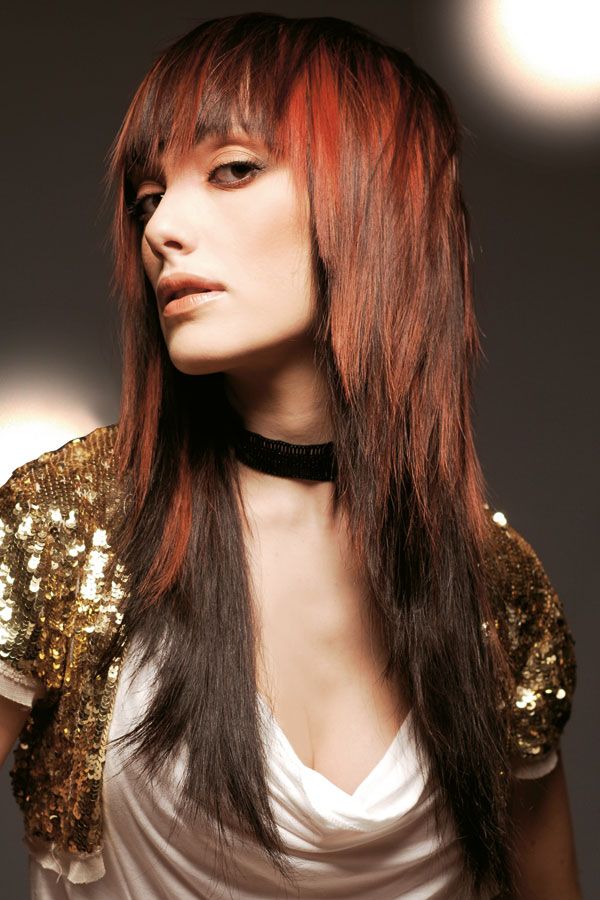 Великолепно впишется в прическу длинная до бровей гладкая абсолютно прямая челка – он создаст модный контраст с оформленными перышками прядями. А можно проредить и самую длинную челку , в этом случае будет лучше, если она выстрижена «аркой» — от середины лба до боковых прядей.