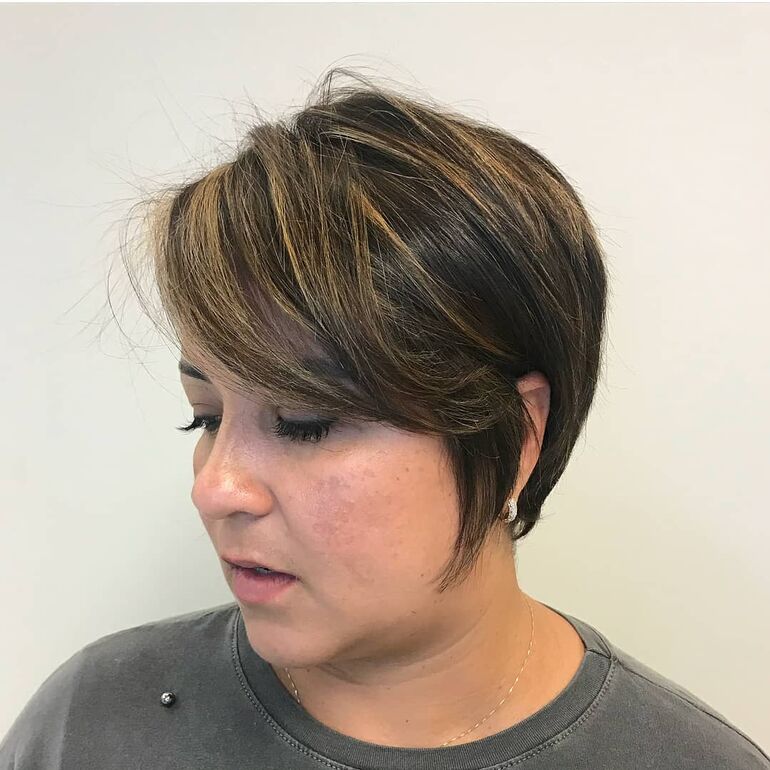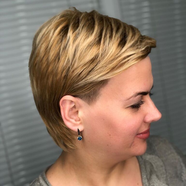 Прическа для женщин старше 40 лет и с избыточным весом- Стрижка пикси с перьями на короткие волосы