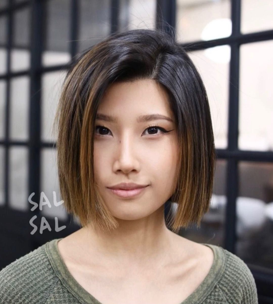 Острая стрижка до подбородка сочетается с передним бобом, чтобы скрыть излишнюю округлость и создать скульптурный вид. Попробуйте этот, если не хотите выглядеть слишком мейнстримно и скучно!