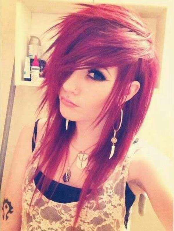 Эта длинная коричневая прическа в стиле эмо с красной челкой выглядит очень привлекательно на молодых женщинах. Волосы уложены слоями, чтобы они казались короче…