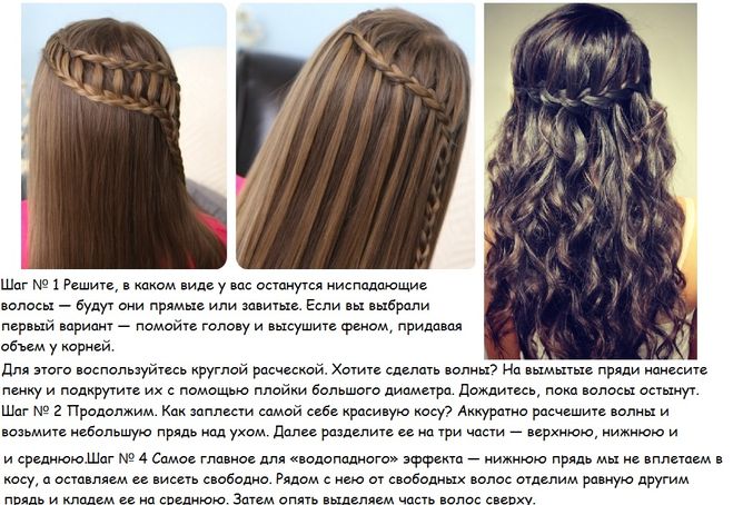 Способов плетения этой прически существует несколько. Если у вас кудрявые или волнистые волосы, «струи» водопада будут прекрасно смотреться. Если ваши волосы прямые, то лучше их завить с помощью плойки, либо утюжка для волос.