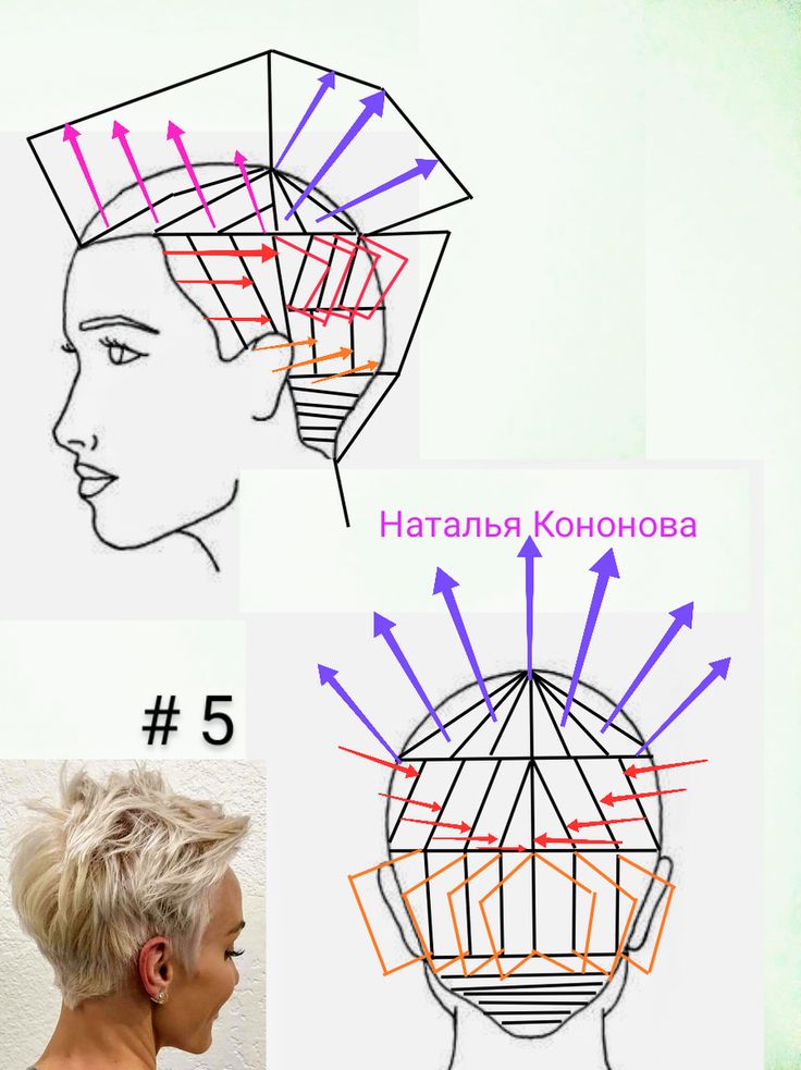 Схема 6.6) Укороченная стрижка «Пикси», выполненная в диагональных и вертикальных линиях. Подходит любым волосам. Великолепно держит укладку. Стрижка универсальна. Благодаря объёмной фронтально-теменной секции, может укладываться разнообразно.