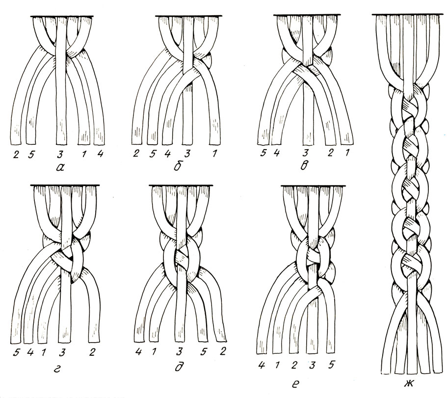 Продолжайте плетение: крайнюю правую нить накладывайте всегда поверх 2 соседних, крайнюю левую заводите под 2 соседние, в середине косички нити перекрещивайте (рис. 150, д).