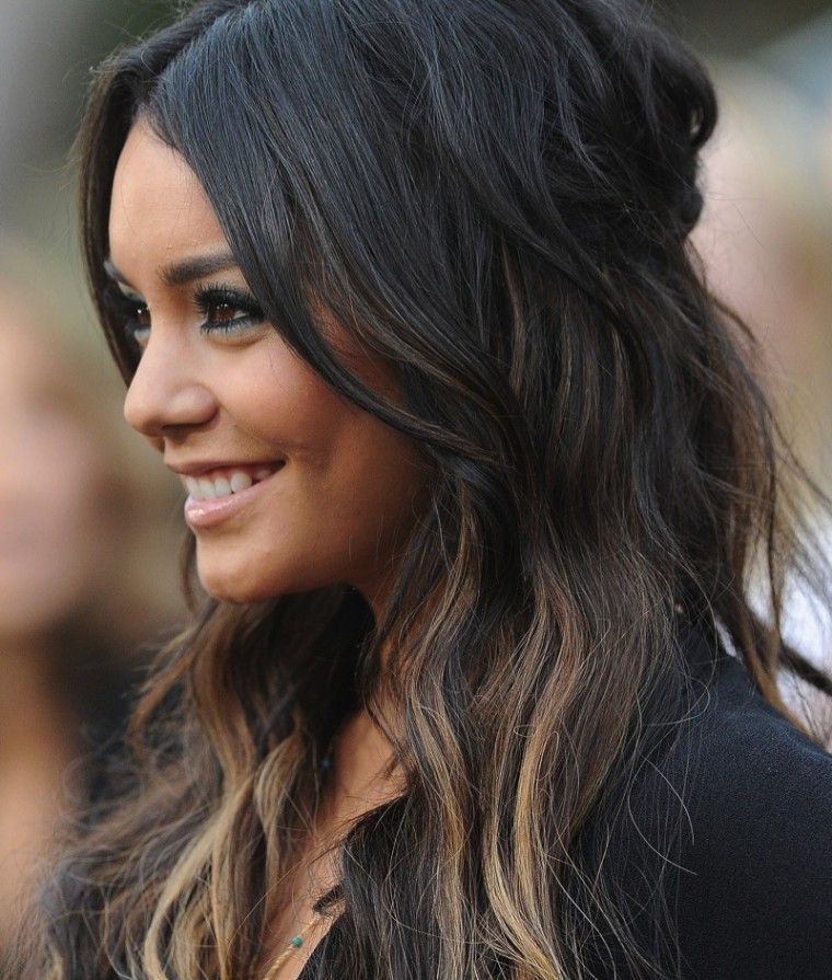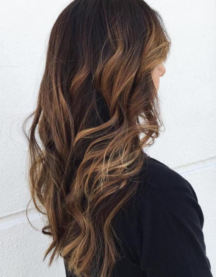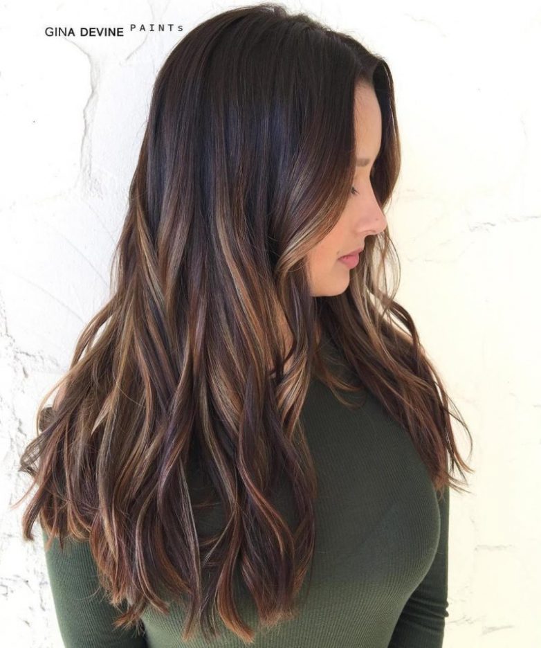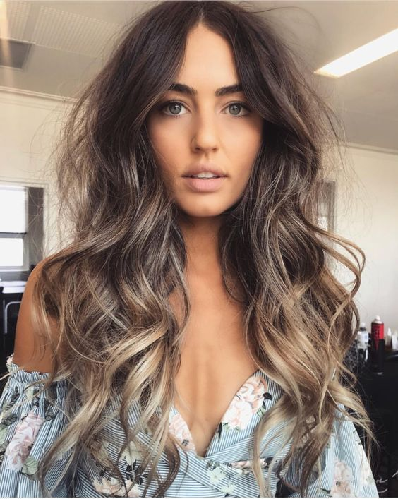 Темные волосы со светлыми прядями выглядят по-разному в зависимости от их длины и формы стрижки. Для длинных волос подходят все техники мелирования. Особенно те, что имитируют блики: шатуш, балаяж, калифорнийское.