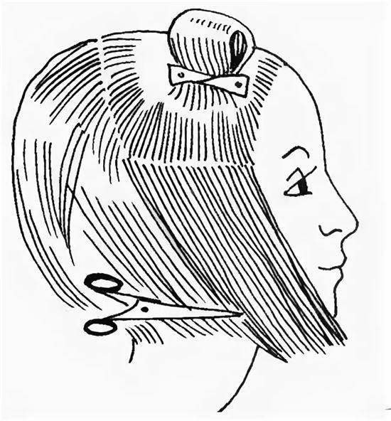 - Волосы на уровне затылка отделяются горизонтально и отстригаются с контролем по прядям на шее.