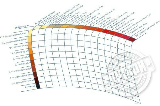 Из таблицы видно, какой тон какому исходному цвету соответствует. К примеру, при блондировании черных волос сначала проступает красный оттенок, затем бурый и так далее, ступенчато. Эта таблица поможет подобрать точную рецептуру окрашивания, процент оксида и избежать неприятных «сюрпризов».