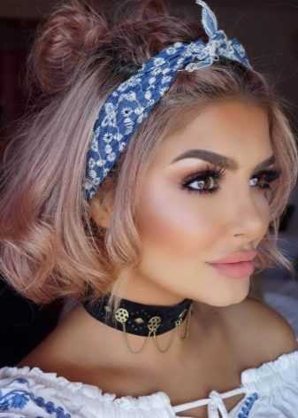 - Высокий пучок — делают небольшой начес и собирают локоны на затылке. Нижние пряди аккуратно закручивают и закрепляют «невидимками». Затем пышные пряди с начесом укладывают на сформированную конструкцию. Результат фиксируют лаком. Чтобы прическа смотрелась более эффектно, используют заколку или красивый ободок.
