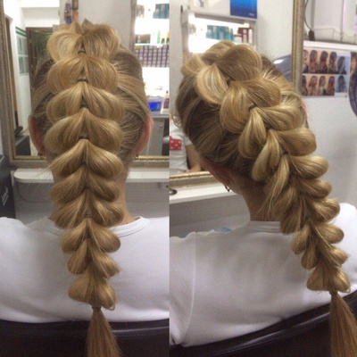 От них отделяются совсем тонкие части и перекидываются друг через друга для того, чтобы было проще создавать такой шедевр. У основания прическу можно закрепить резинкой.